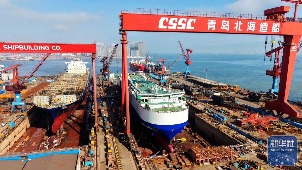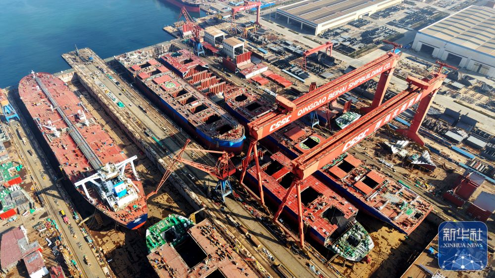↑ 2月25日,山东青岛海西湾船舶与海洋工程产业基地生产工地一派繁忙(无人机照片)。新华社发(俞方平摄)
