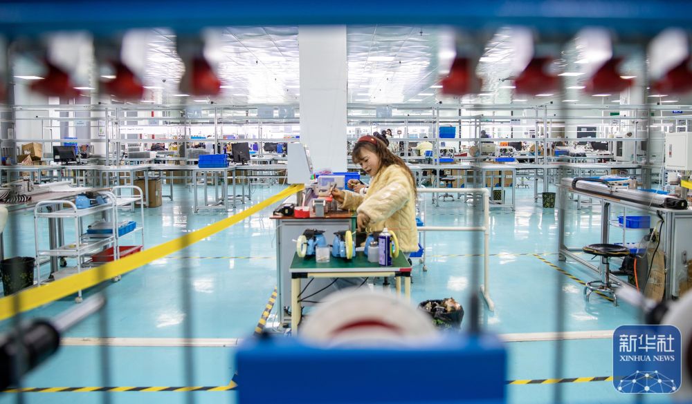 ↑ 2月24日,在湖南省永州市道县高新技术产业开发区,工人在适配器生产企业流水线上工作。新华社发(蒋克青摄)