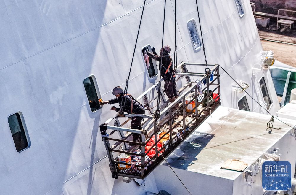 ↑ 2月25日,在山东省荣成市石岛管理区修造船产业基地,工人在清理涂装残留物(无人机照片)。新华社发(李信君摄)