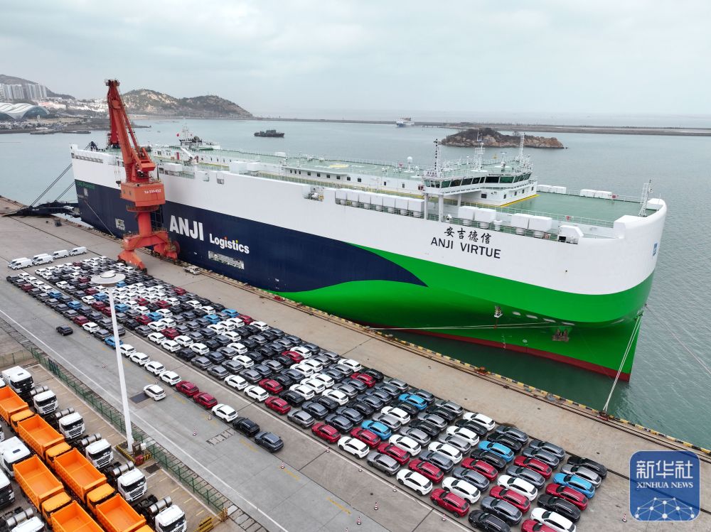 ↑ 2月25日,在江苏省连云港港东方港务分公司码头,滚装轮停在泊位装载出口汽车(无人机照片)。新华社发(王春摄)