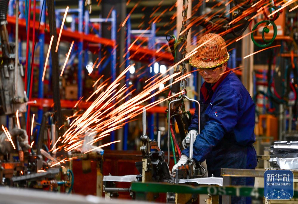 ↑ 2月25日,在位于安徽省合肥市肥西县的一家汽车零部件加工制造企业,工人在生产线上进行焊接作业。新华社发(徐勇摄)