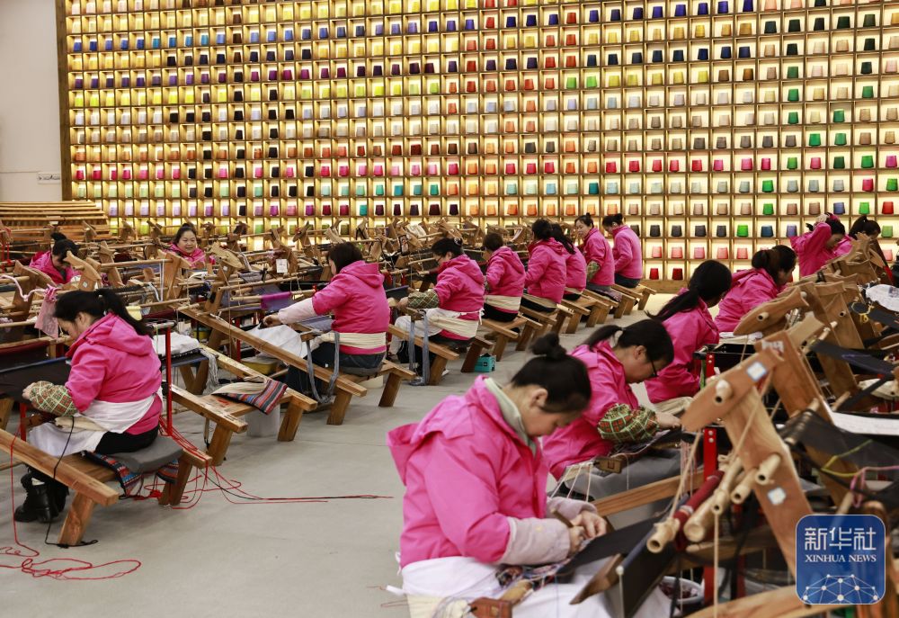↑ 2月24日,在湖南省张家界市武陵源区乖幺妹土家族织锦生产研发基地,工人制作土家族织锦产品。新华社发(吴勇兵摄)