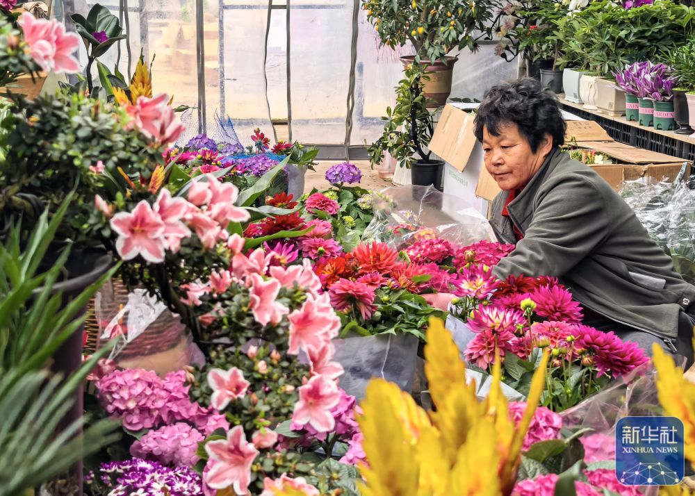↑ 2月25日,在山东省乐陵市一花卉种植大棚,花农对花卉进行管护。新华社发(贾鹏摄)