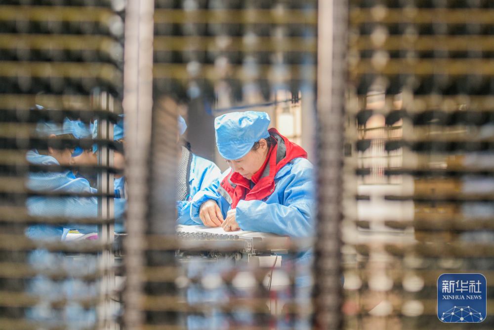 ↑ 2月24日,在位于河南省商丘市睢县高新技术产业开发区的商丘中轩电子科技有限公司电子线束生产车间内,工人赶制电子排线外贸订单。新华社发(徐泽源摄)