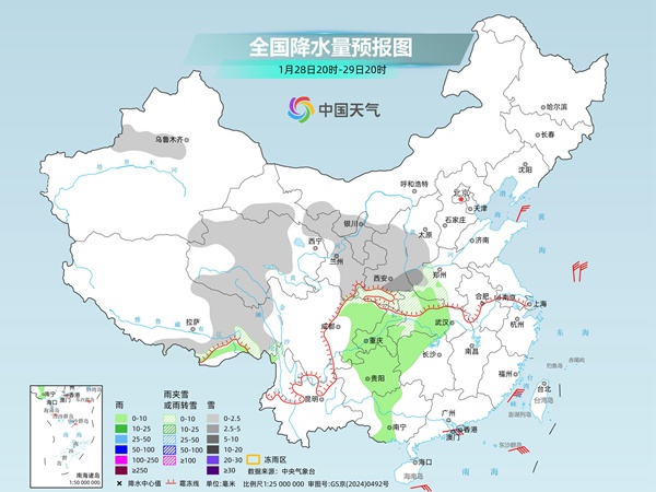 预计29-31日,西北地区东部、华北、黄淮及湖北西部、湖南西北部等地有小到中雪或雨夹雪,部分地区有大雪,湖北西部、贵州东部、湖南西北部等地部分地区有冻雨,江南大部、华南等地有小到中雨。