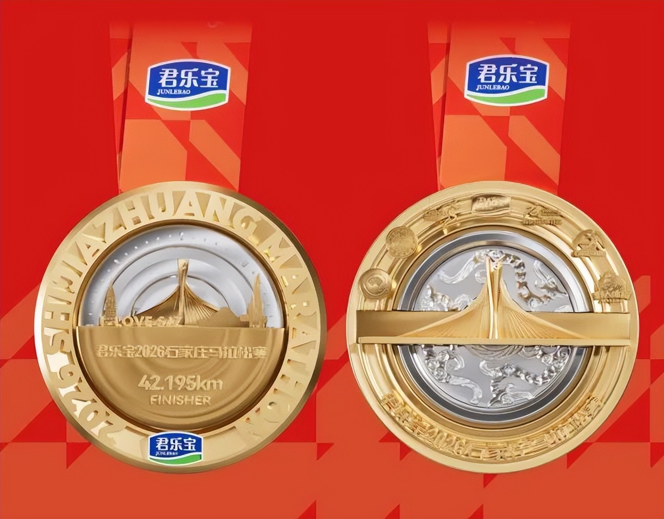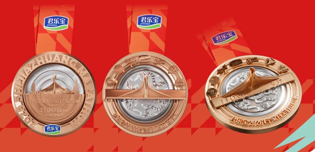 整体造型为圆形设计,“石家庄”三字环绕成圆,如一枚独特的城市印章,将归属感凝练于胸前,以城市之名,为奔跑者加冕。