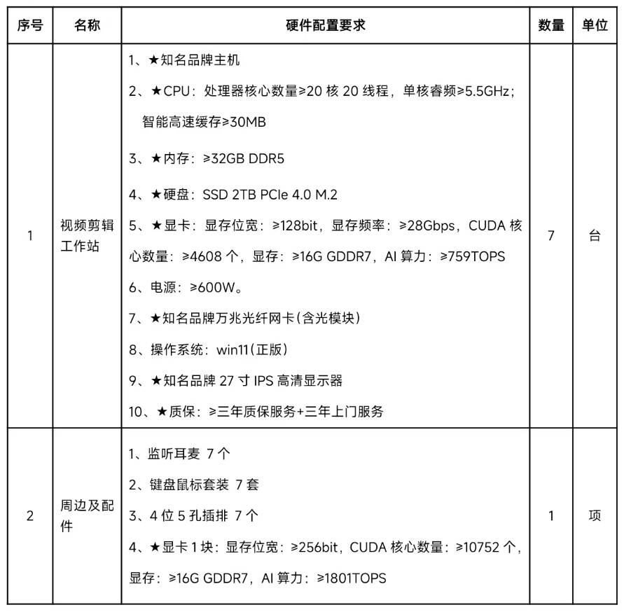 根据上级对我台新媒体宣传报道高标准要求,为保障报道迅速及时、制作精良、更好地提升新闻的传播力和影响力,本次采购高性能工作站7台及相关周边配套产品,用于使用剪映软件进行视频剪辑,满足新媒体节目的剪辑和专题制作需求,确保多轨道视频剪辑、复杂特效渲染时的高效运算。同时工作站配置万兆网卡,用于连接我台现有共享存储系统,实现素材的快速存储和共享剪辑。