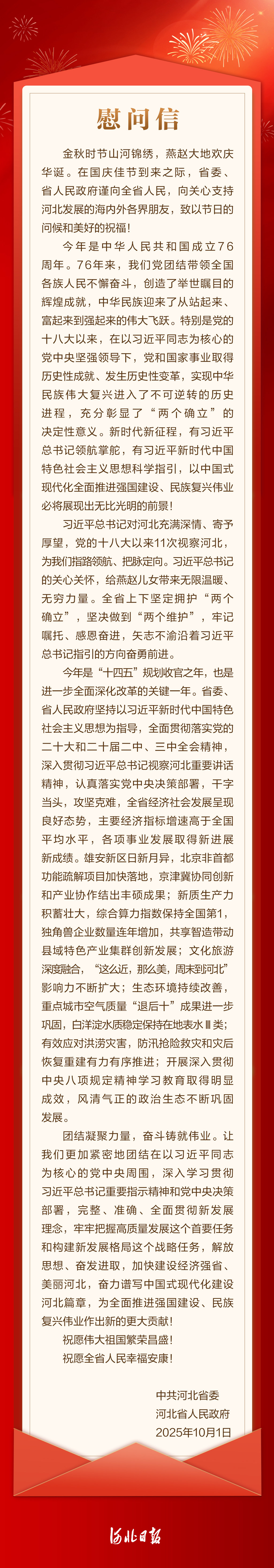 在国庆佳节到来之际,河北省委、省人民政府谨向全省人民,向关心支持河北发展的海内外各界朋友,致以节日的问候和美好的祝福!