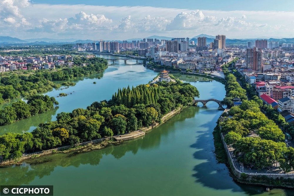 ↑2025年8月25日在湖南省永州市道县城区潇水河畔拍摄的景色。(无人机照片)CICPHOTO/蒋克青 摄